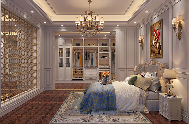 主臥空間的裝飾沒有動用太多筆墨,一幅竹林畫搭配地面木紋,輕易將中式的美感勾勒出來。獨立的衣帽間,根據墻面內嵌,對空間充分利用,把那些邊角的空間也都變廢為寶。