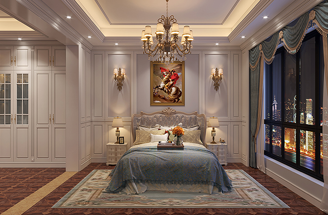 各種到頂柜體設計,既有掩門設計的儲物柜,又有開放式的儲物格,想要怎么收納就怎么收納。墻邊掛上描金邊框的掛畫,餐桌椅線條簡潔嚴謹,外形厚重端莊,流露出尊貴的皇室風情和文藝氣息。