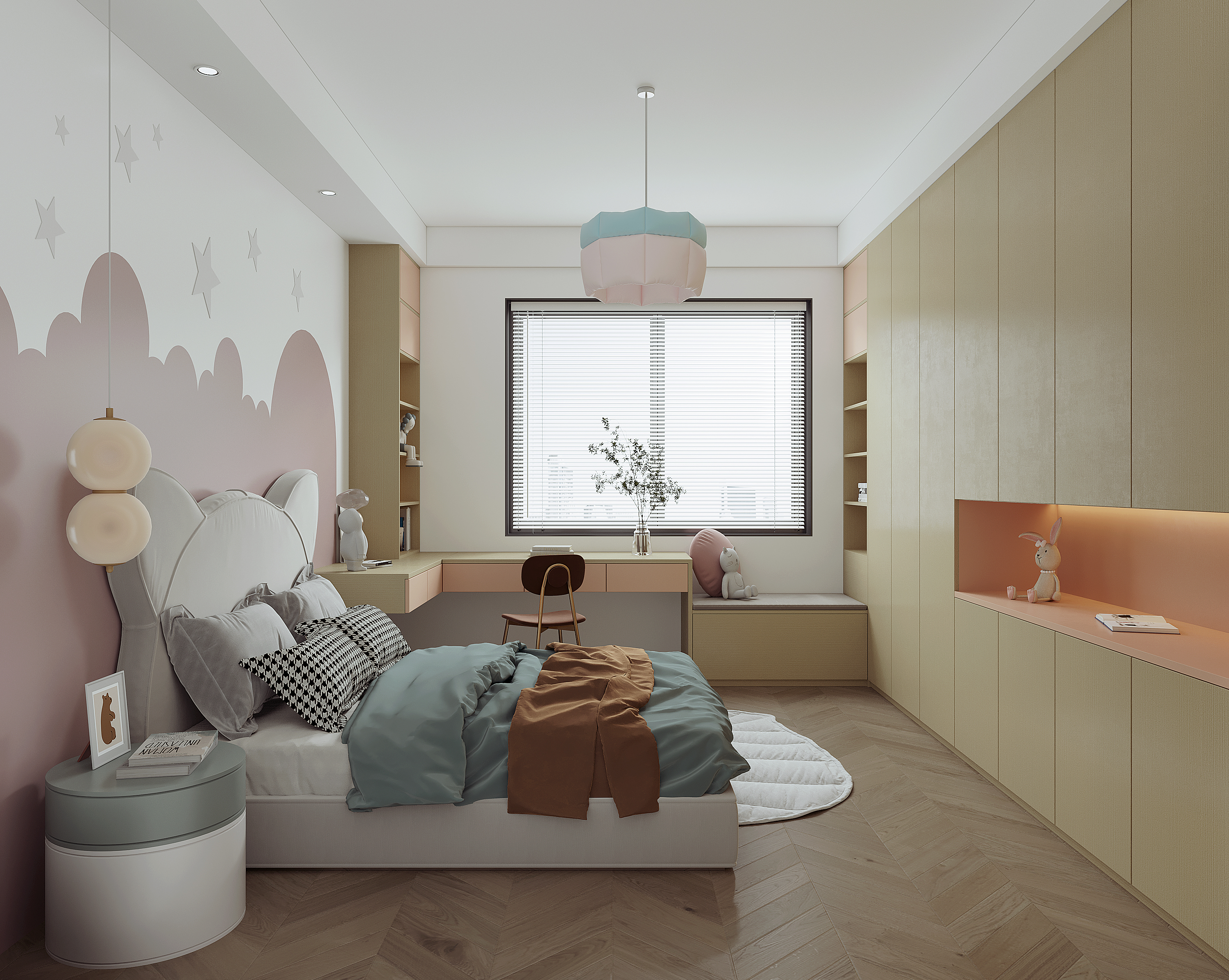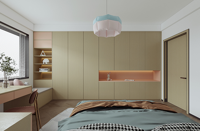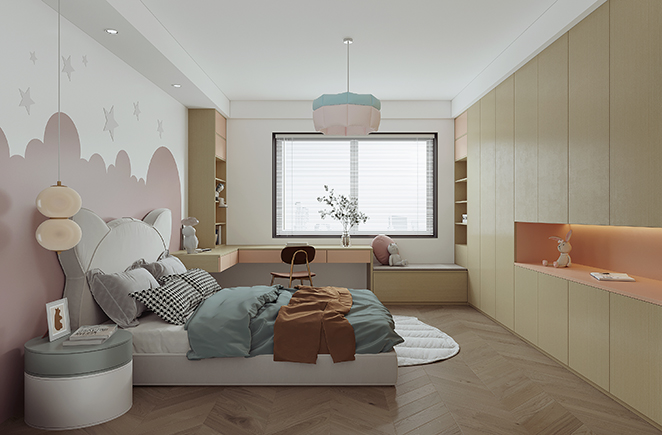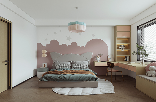 墻面增添了十分童趣的墻畫作為裝飾,衣柜在腰部還設計了展示區,方便存放書籍和小物品。